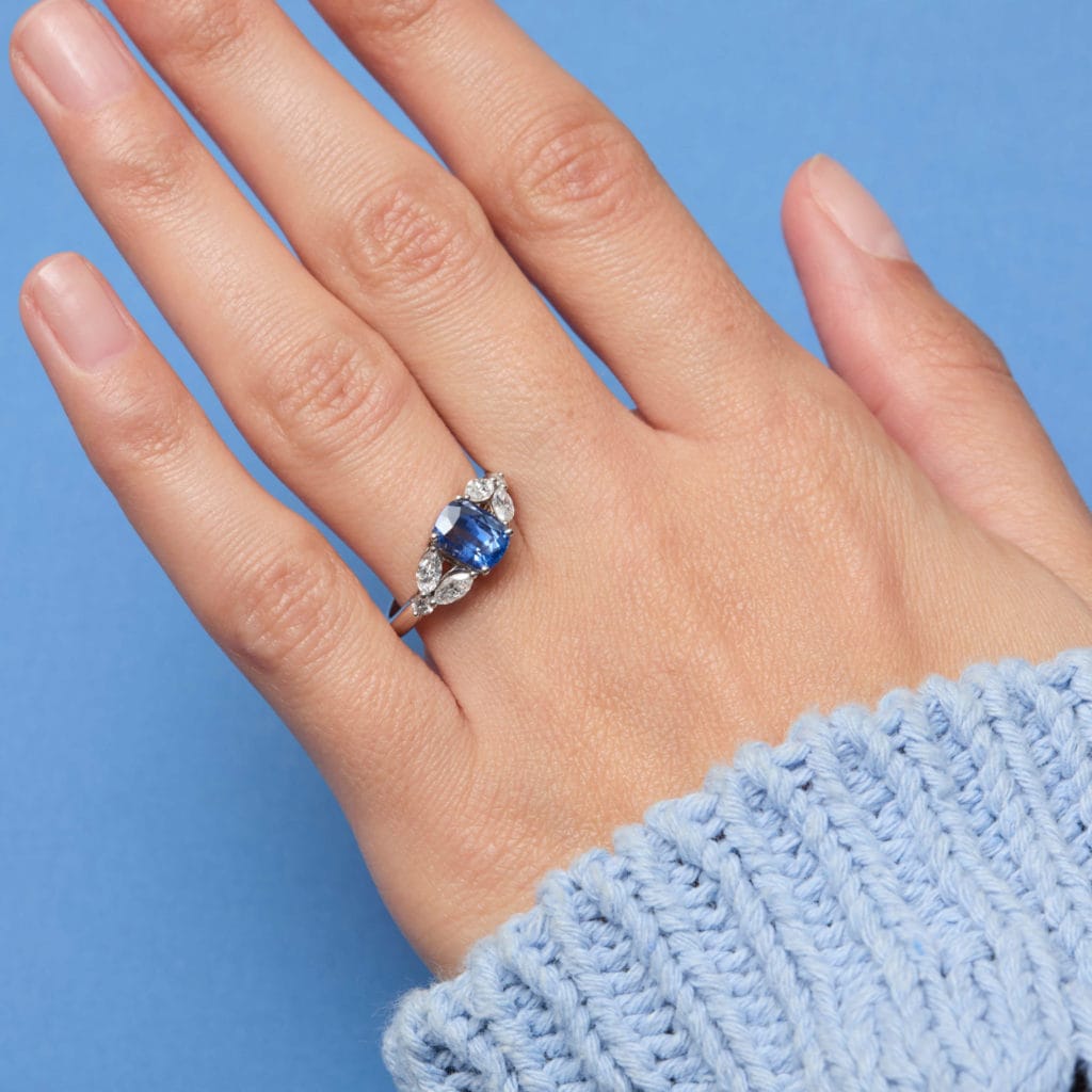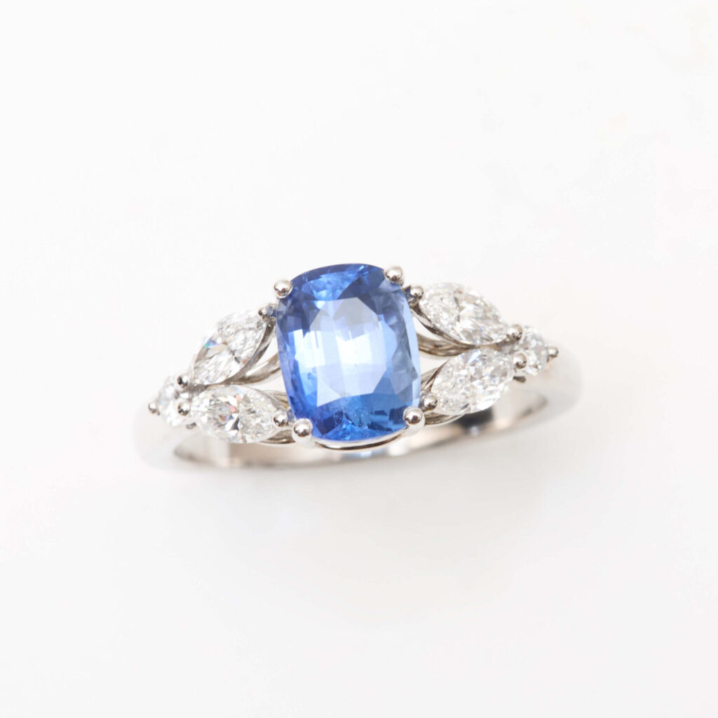 La bague Althea attire par sa beauté subtile. L’or blanc, symbole de pureté et de distinction, met en valeur un saphir Cornflower au bleu délicat et lumineux. Sa forme coussin ajoute une touche de douceur, apportant équilibre et harmonie à l’ensemble.