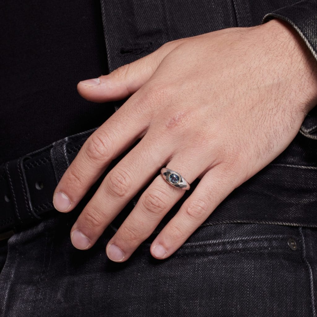 La bague Anil en or blanc, avec son captivant Saphir Teal de forme ovale, encadré par un sertissage en clos et rehaussé d’une finition facettée, incarne une élégance raffinée.