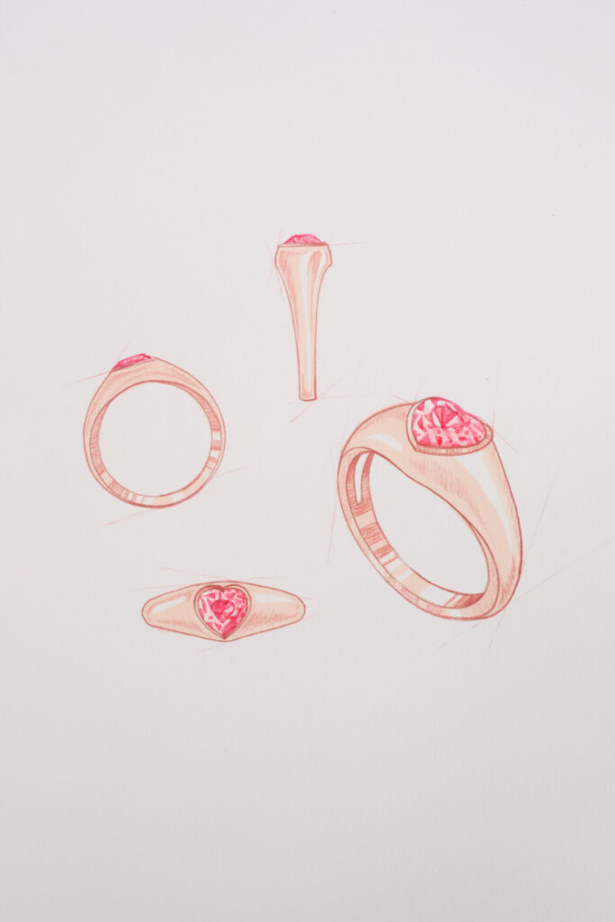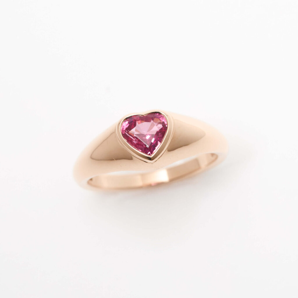 L’or rose apporte chaleur et douceur au spinelle rose. La taille cœur renforce le côté tendre et moderne de la bague.