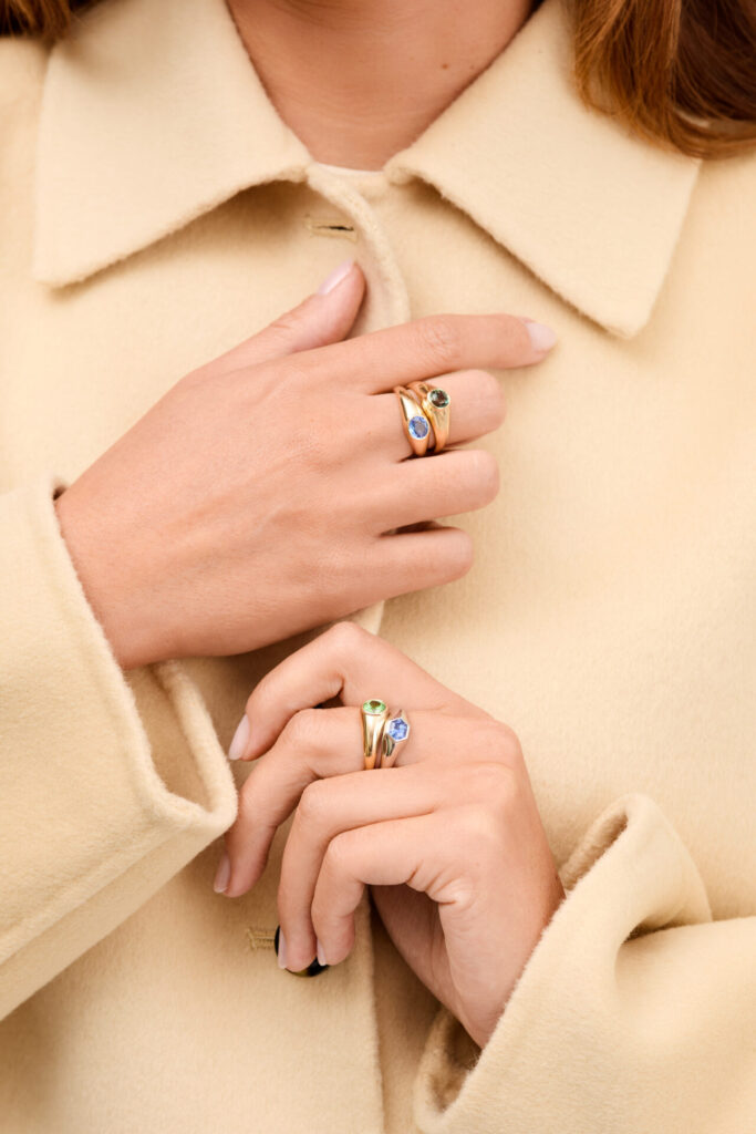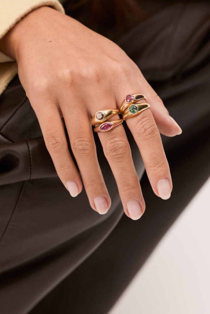 Des bagues au caractère fort, dessinées autour d’un anneau d’or large et d’une pierre éclatante.