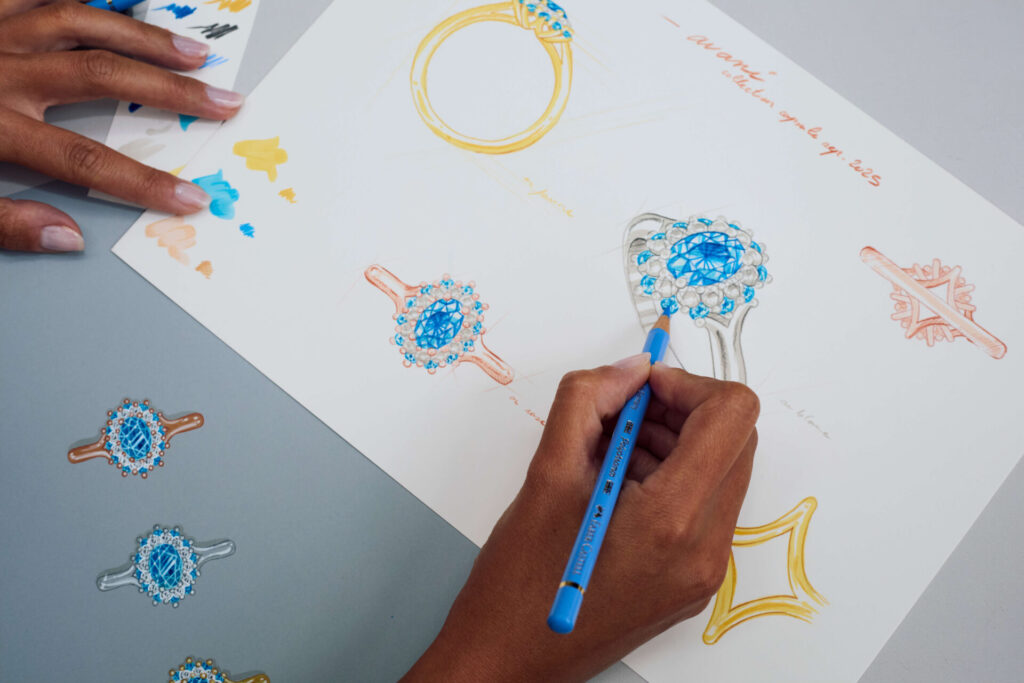 Seulement dix pièces : trois déjà prêtes, sept à imaginer avec vous. Choisissez votre saphir, votre or, et nous créons la vôtre dans notre atelier parisien.