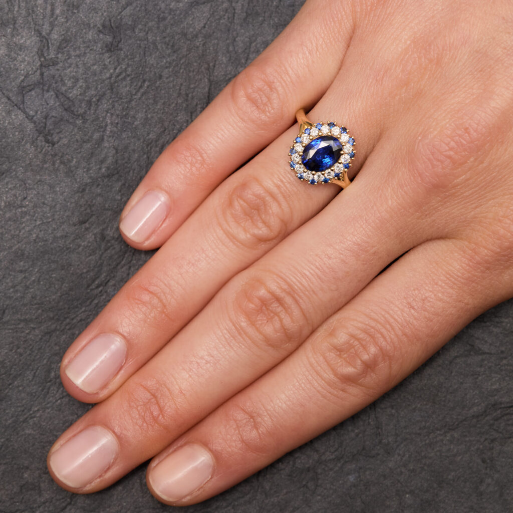 L’or jaune apporte une chaleur douce et intemporelle, tandis que le saphir Peacock dévoile ses nuances profondes et impétueuses. Le double entourage de diamants et de saphirs bleus vient sublimer la pierre centrale et apporte une touche lumineuse à cette création équilibrée.