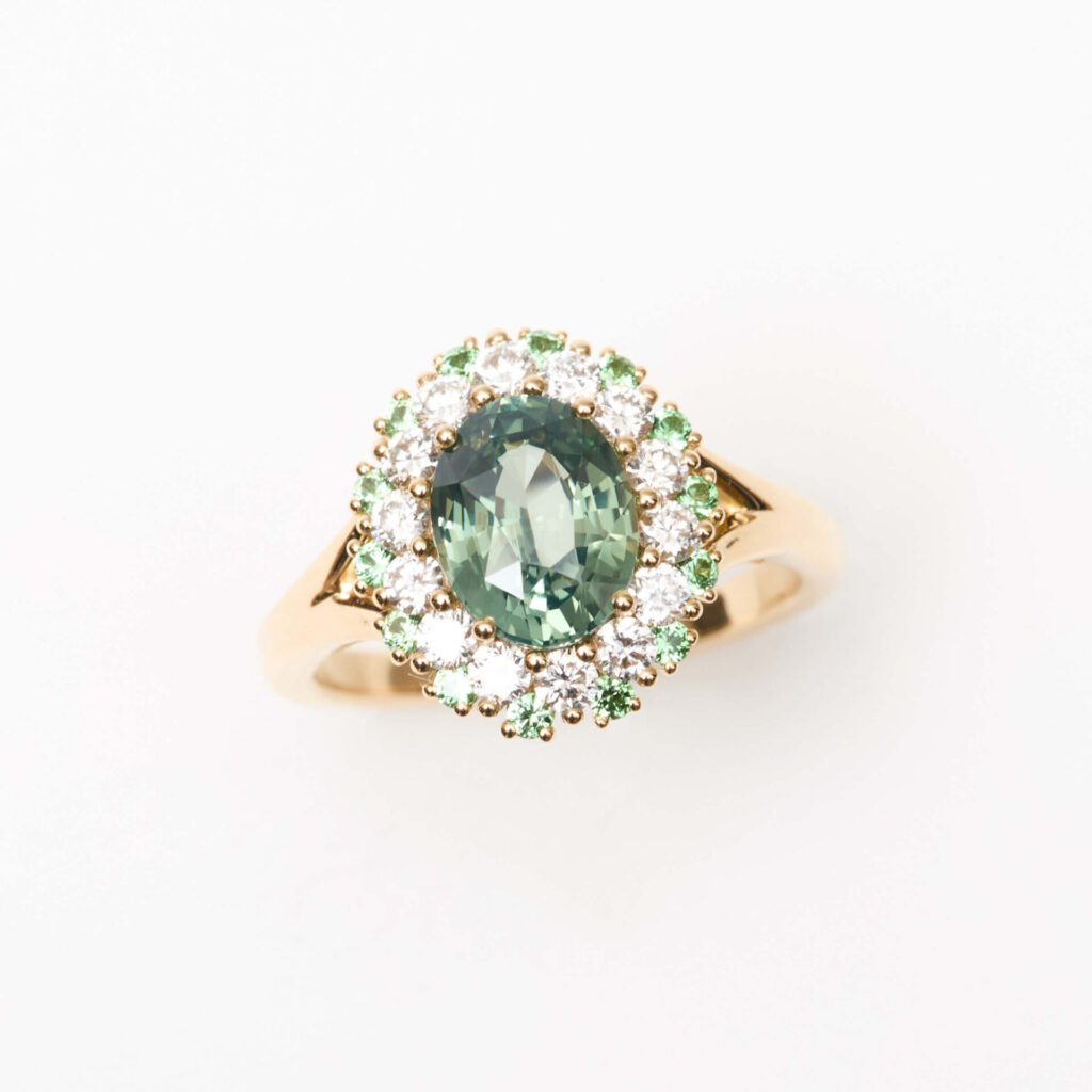 Notre modèle Colombo, singulier d’Avani Paris, se pare ici d’or jaune, symbole d’élégance et de caractère. Il accueille une pierre aussi moderne que délicate : le Saphir Vert de forme ovale. Le tout est accompagné de 14 diamants et 14 Tsavorite Mint qui viennent s’accorder avec subtilité aux nuances vertes de la pierre centrale.