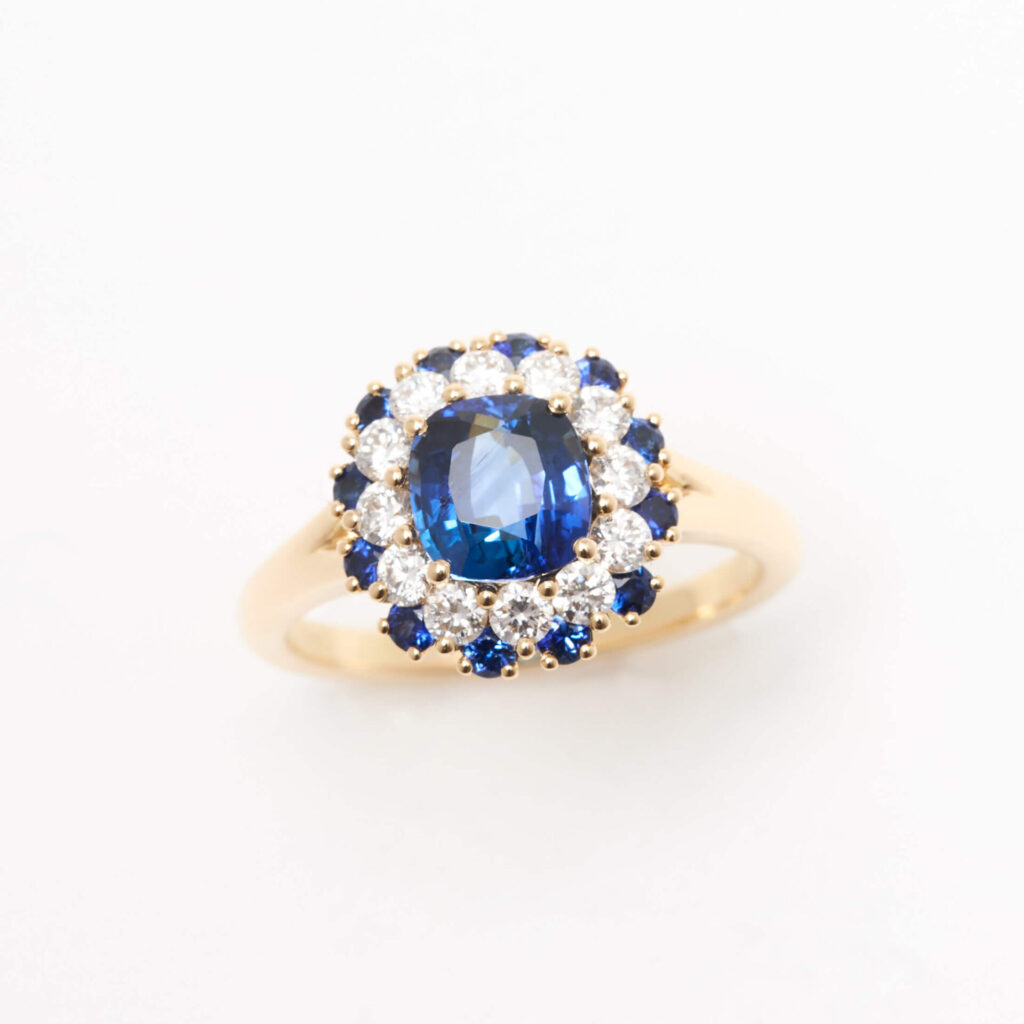 Cette Colombo Matara associe l’or jaune intemporel au bleu lumineux du Vivid Blue. Les reflets cristallins de la pierre ressortent, et le double entourage apporte éclat et harmonie à l’ensemble.
