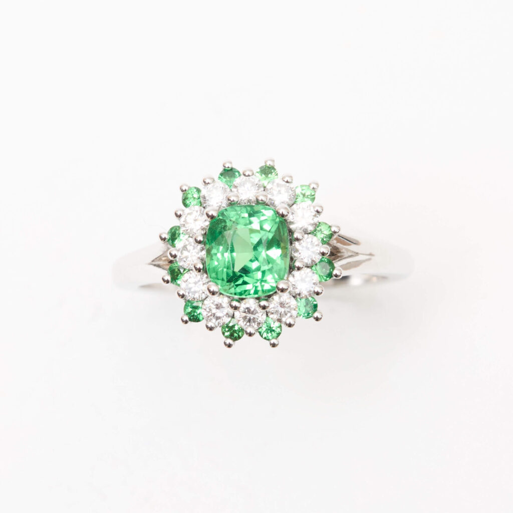 La bague Colombo en or blanc sublime la féérie et la majesté de la Tsavorite. Son double entourage ajoute une pureté éclatante et crée un effet chromatique qui intensifie la couleur unique de la Tsavorite.