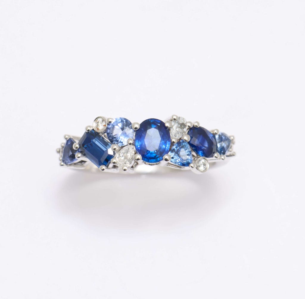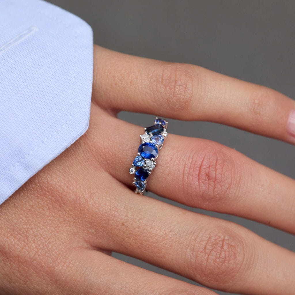 Cette bague réunit les nuances profondes du Saphir Peacock, éclairées par des touches de bleu plus clair. L’or blanc souligne cette harmonie, donnant une impression de ciel étoilé. Moderne et épurée, elle joue avec la lumière de façon subtile.