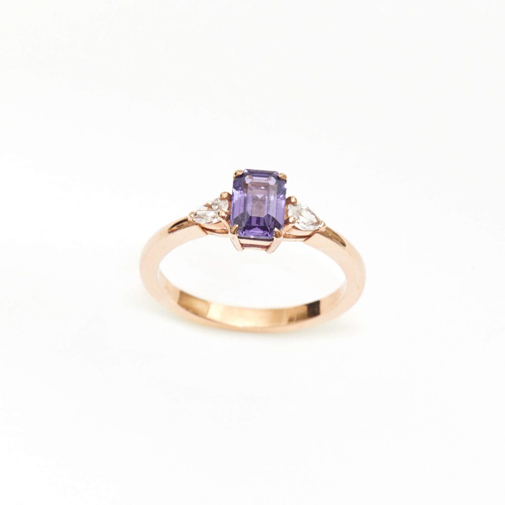 L’association du Saphir lavande, de l’or rose et des diamants lie pureté et modernité dans un même écrin. Le saphir lavande par sa couleur symbolise le calme et la grâce. Le diamant vient mettre en symbiose les énergies tandis que l’or rose apporte fraîcheur et harmonie.