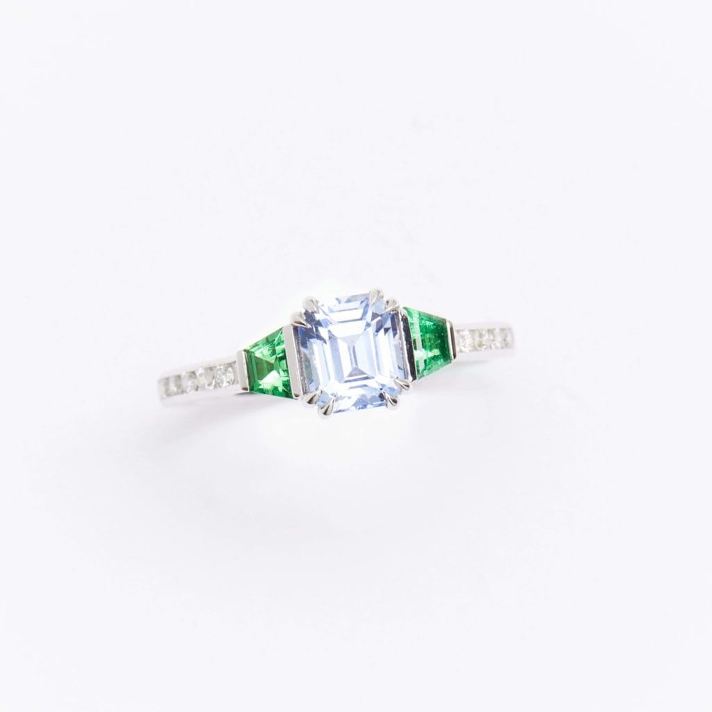 L’association de l’or blanc et de ce Saphir bleu pastel et de la Tsavorite lie passion et limpidité dans un même écrin. L’or blanc est un symbole d’élégance, le saphir pastel et la Tsavorite sont synonymes de fraicheur.