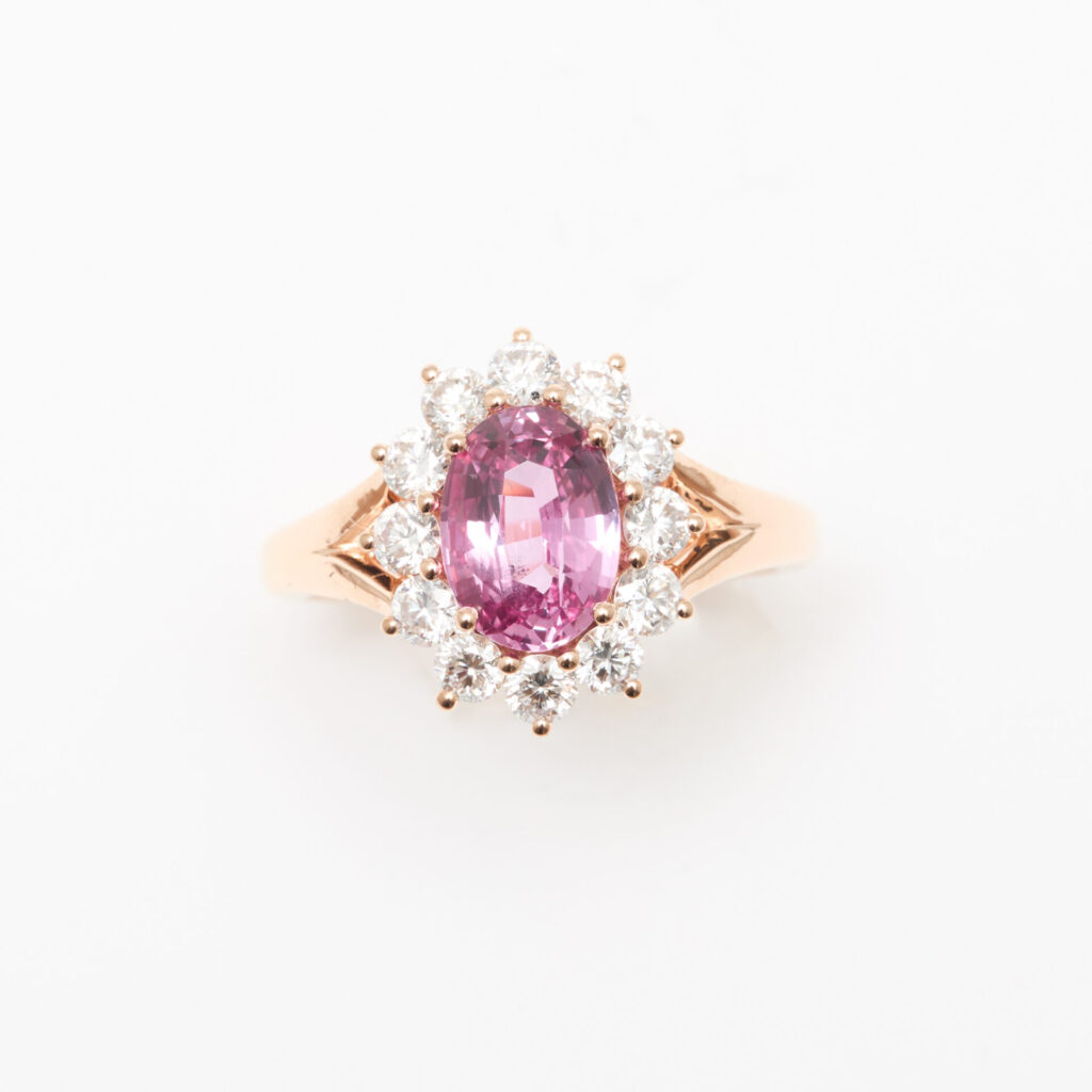 Notre modèle Ella, revisite iconique de la marguerite, se dévoile ici en or rose, symbole de douceur et de modernité. Elle accueille un Saphir rose de forme ovale non chauffé, une pierre lumineuse à l’élégance délicate, sublimée par un entourage de 12 diamants.