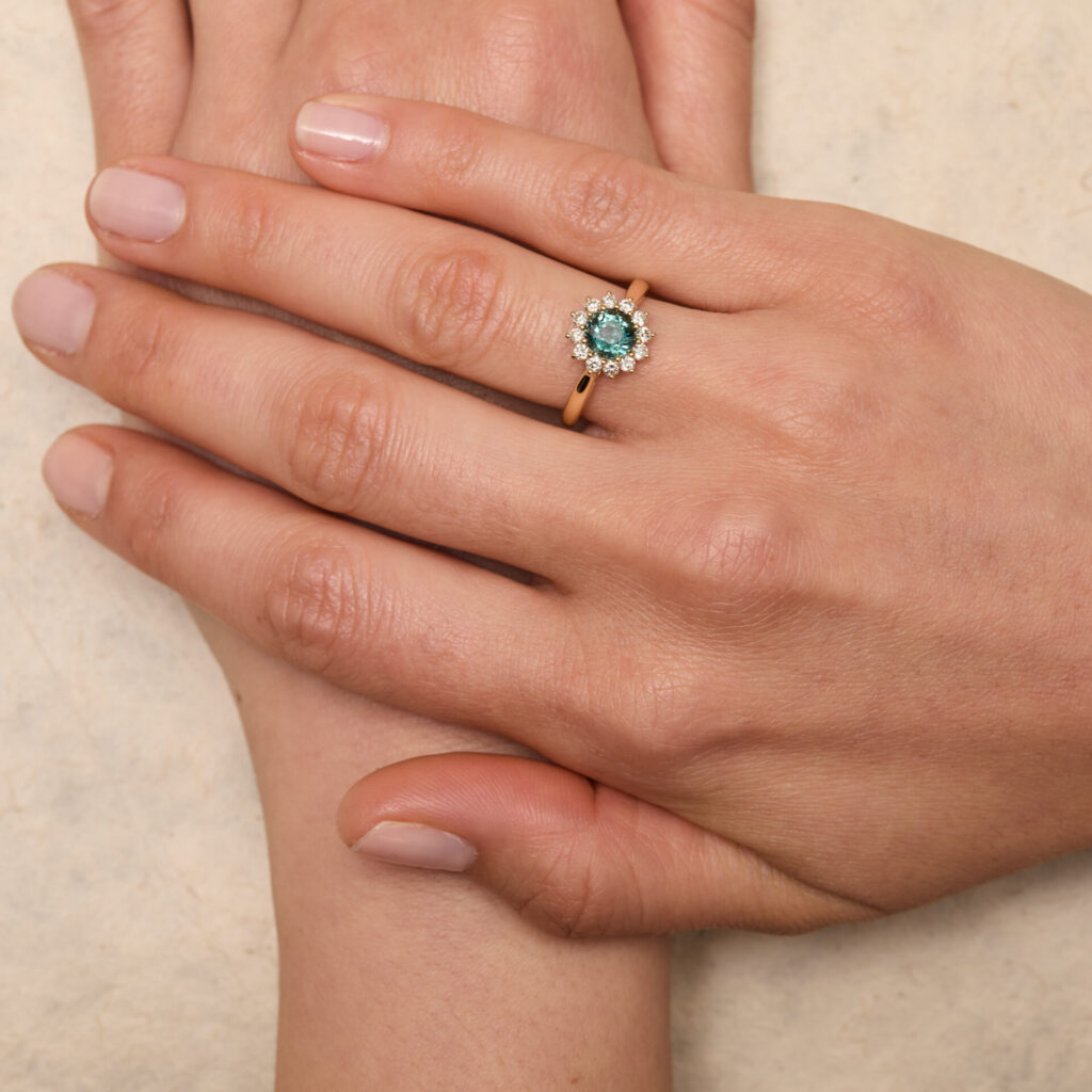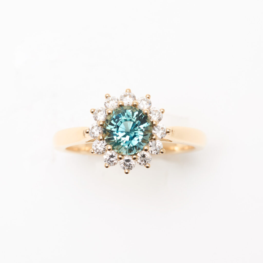 Cette bague Ella est d’une élégance tout simplement contemporaine. En or jaune, symbole d’élégance et de chaleur, elle accueille en son centre un magnifique saphir Teal de forme ronde, dont les nuances de bleu et de vert contrastent avec délicatesse. Les diamants, quant à eux, apportent une touche de pureté à l’ensemble.