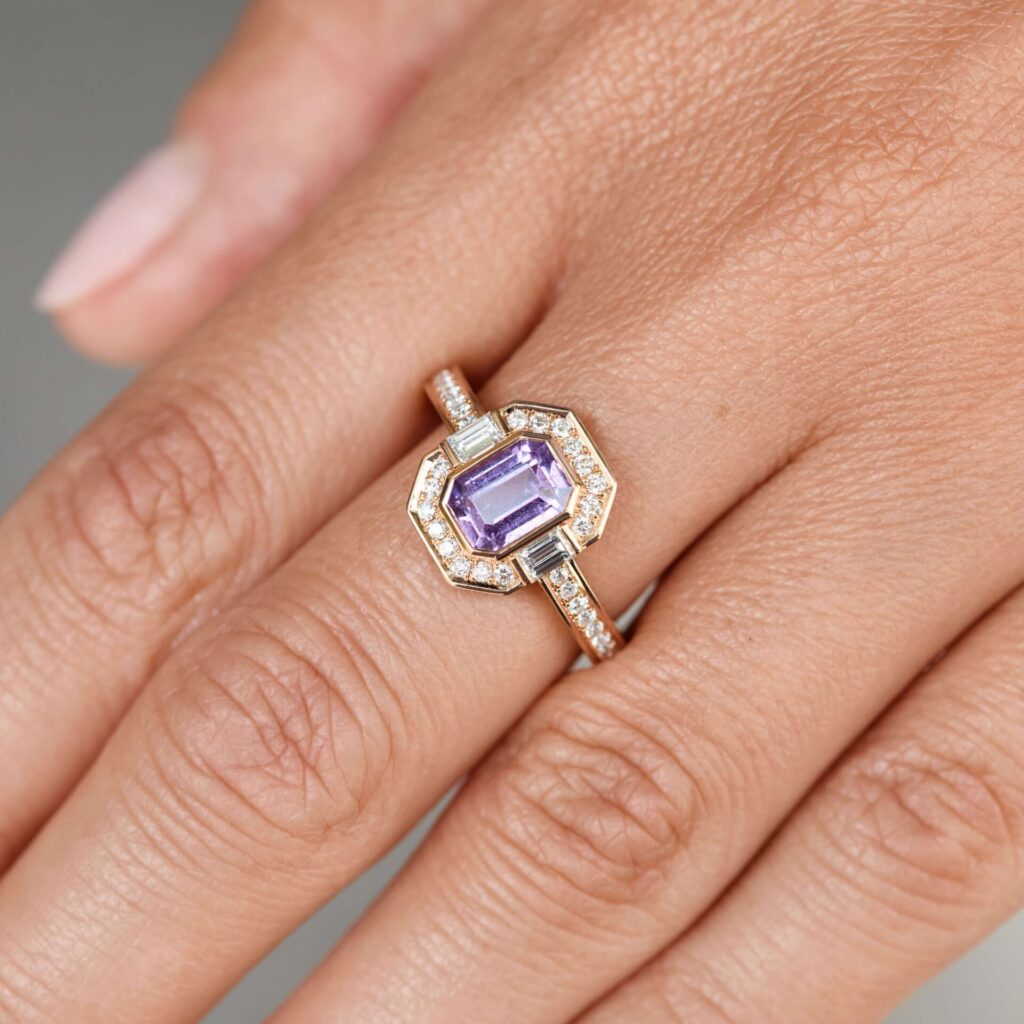 Cette bague Jaffna adopte des lignes Art-Déco, avec ses courbes affirmées et son éclat en or rose autour d’un superbe saphir rose de taille émeraude. La symbiose des teintes est renforcée par 36 diamants, qui viennent ajouter grâce et harmonie à l’ensemble.
