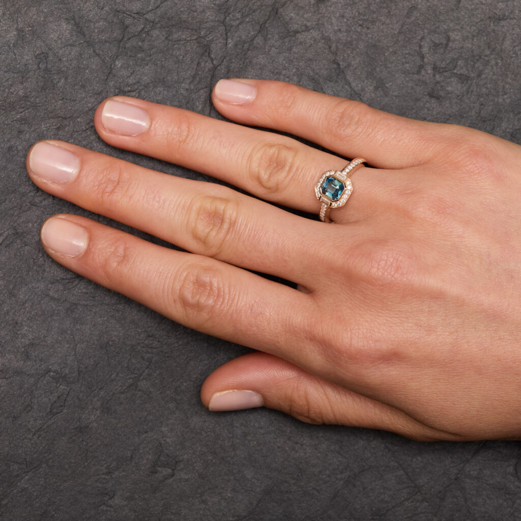 Ici, l’artisanat Avani Paris associe l’art contemporain au charme de l’Art Déco. En or rose, cette bague accueille un délicat saphir Teal de 1.15 carat, taille émeraude, qui révèle toute son âme Art Déco grâce à son entourage de diamants ronds et baguettes. Une bague pour les amoureux du style