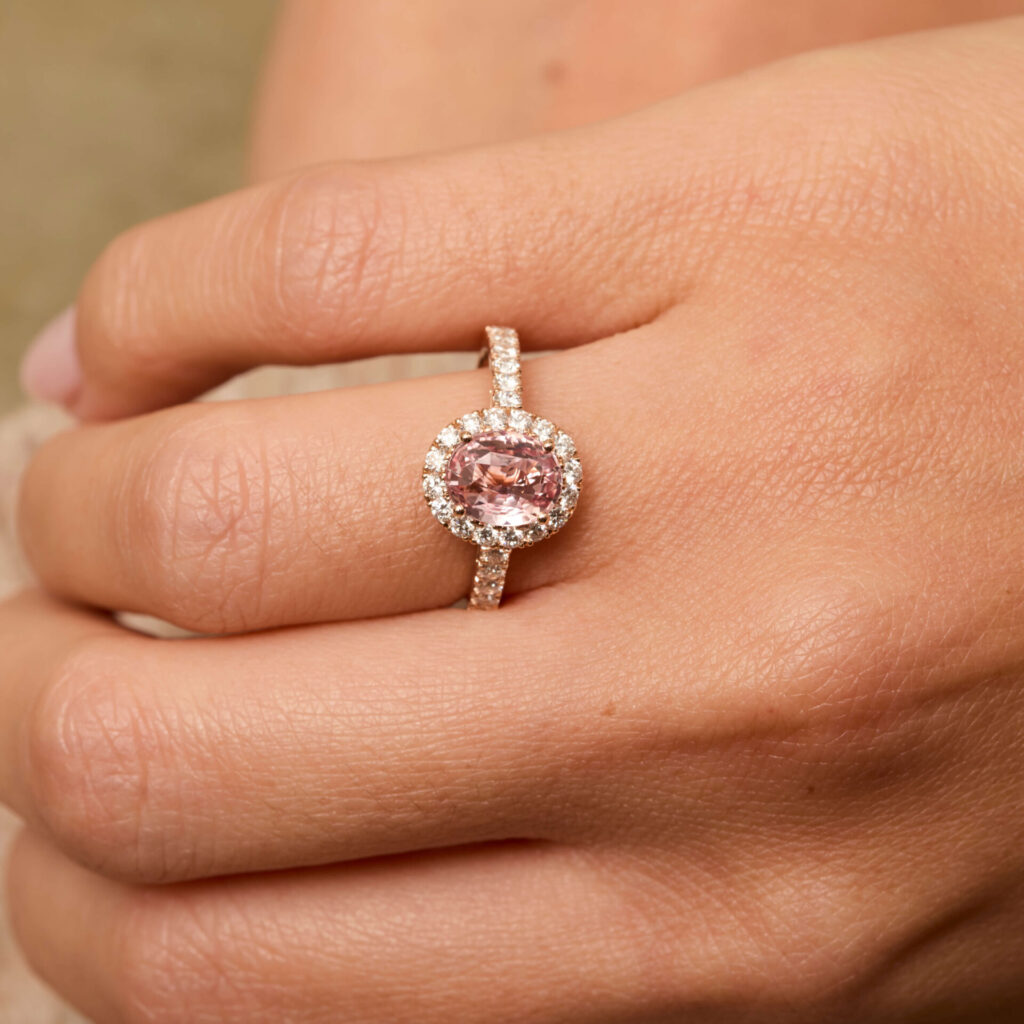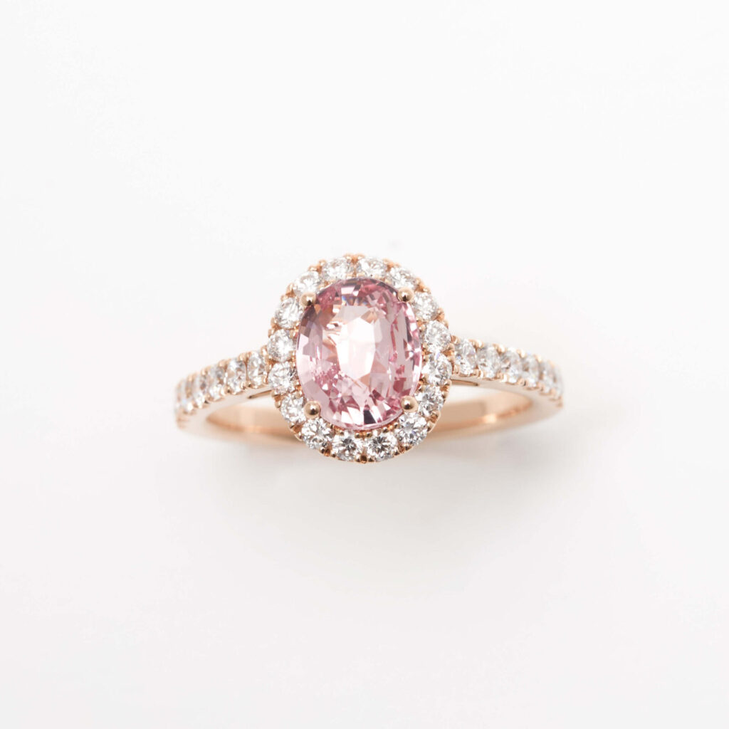 Cette bague Jaffna séduit par sa finesse. L’or rose, symbole de douceur, met en valeur le saphir Padparadscha et ses reflets lumineux. Un entourage de diamants vient sublimer la pierre centrale et accentuer son éclat.