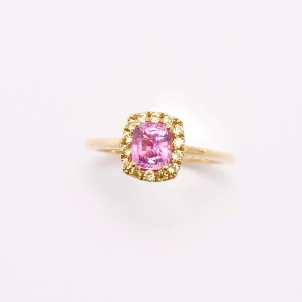 L’alliance du Saphir Rose, de l’or rose et des saphirs jaunes lie passion et joie dans un même écrin. Le Saphir rose est un symbole d’amour et de bonheur, l’or rose vient apporter du désir et de la délicatesse au bijou tandis que les saphirs jaunes évoquent la durabilité et la pérennité d’un couple.