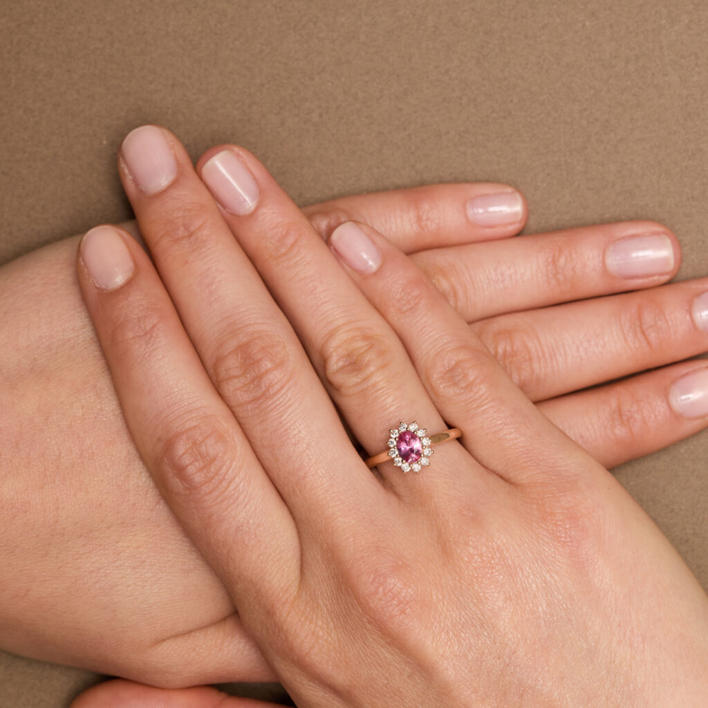 Cette bague Lily Ella revisite notre modèle iconique dans une version plus petite. En or rose, elle met en lumière la beauté d’un Spinelle Mahenge ovale, sublimé par un magnifique entourage de diamants.