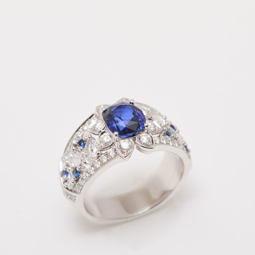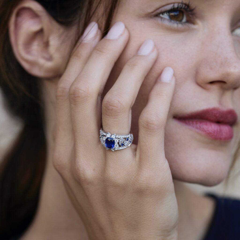 La bague “Margot” est un hommage subtil à la Reine Margot et à la sérénité des Tuileries. En or blanc, ce bijou met en lumière un saphir bleu allongé taillé en coussin, entouré d’une délicate couronne de brillants en forme de fleur. Le corps de la bague, parsemé de diamants en forme de poire, évoque une constellation céleste, tandis que les bordures serties de diamants ajoutent un effet dentelle qui sublime l’ensemble. Une pièce qui incarne la discrétion et l’élégance naturelle.