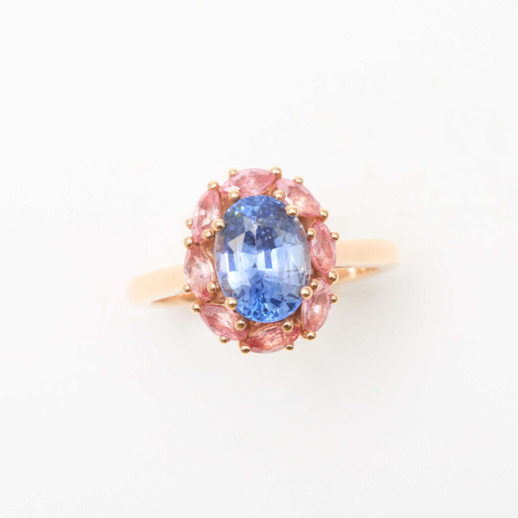 L’association de l’or rose, du saphir Cornflower et des saphirs Padparadscha rappelle le caractère de l’incroyable fleur de lotus et unie romantisme, élégance et richesse dans un même écrin. L’or rose symbolise la grâce, le saphir Cornflower évoque le patrimoine et la richesse tandis que le saphir Padparadsha évoque la tendresse.