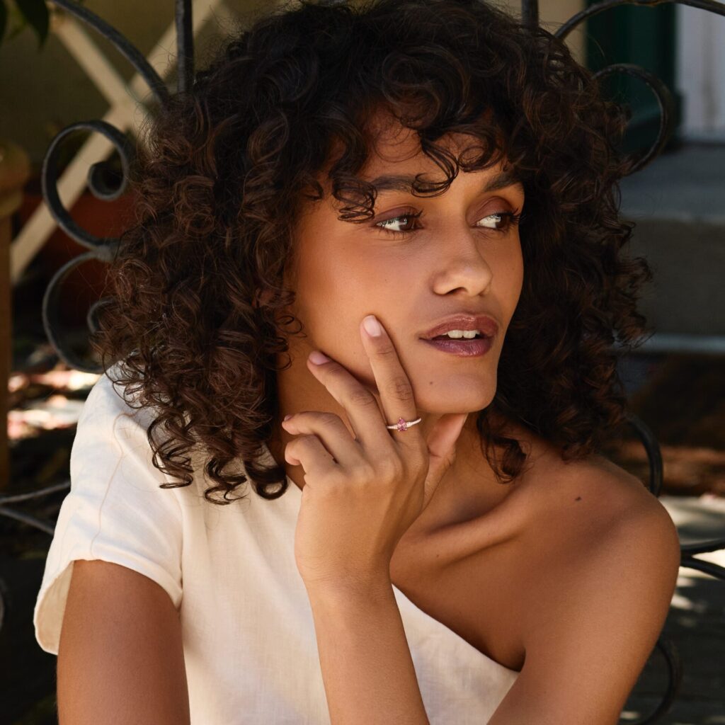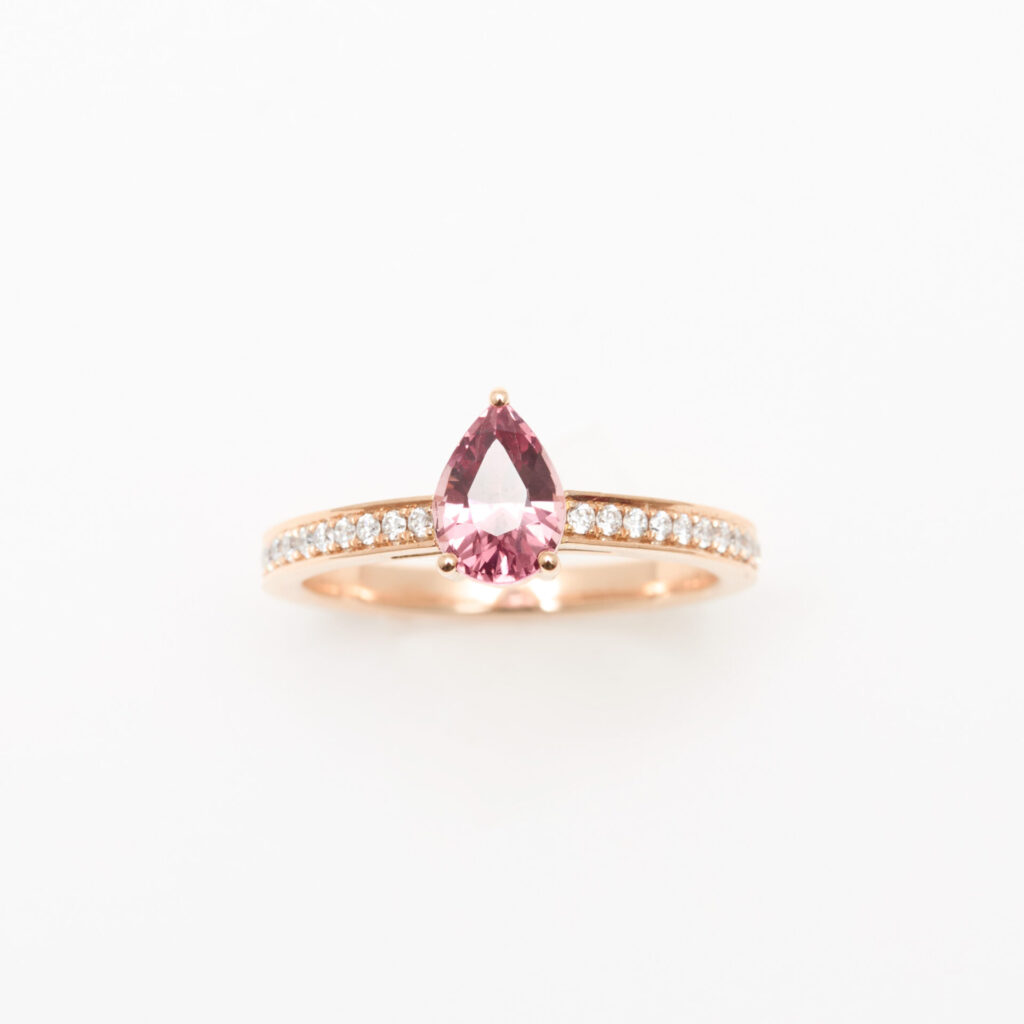 Ce solitaire Trinco est d’une élégance unique, avec une pointe de sophistication. En or rose, symbole de délicatesse, il accueille un grenat Malaya de forme poire, à la couleur divine, qui dégage une grâce inouïe. Le tout est accompagné de 22 diamants qui viennent entourer le bijou.